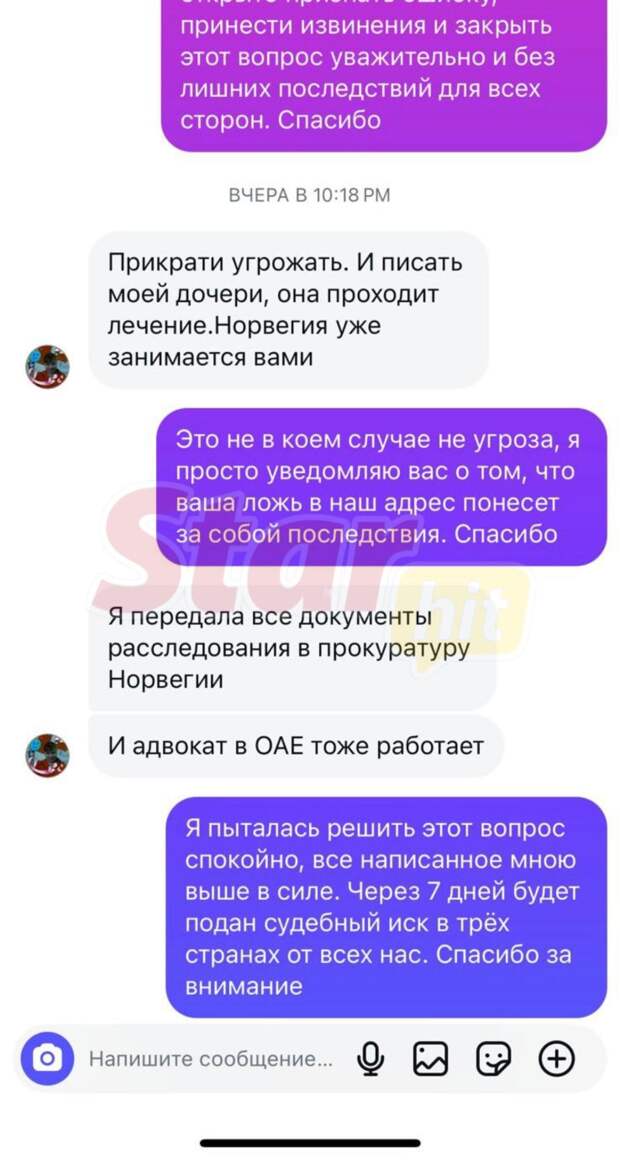 Анна Ковальчук дала весьма резкий ответ. «Прекрати угрожать и писать моей дочери, она проходит лечение. Норвегия уже занимается вами», — написала женщина.