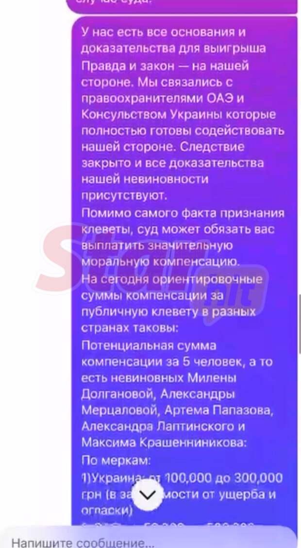 Изначально молодые люди хотели решить вопрос мирным путем и не доводить его до суда. Милена предприняла попытку связаться с Марией Ковальчук, чтобы предупредить о намерениях обратиться в суд, но та не стала читать сообщения.