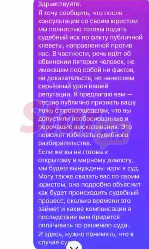 Мы предложили им хороший вариант — в течение 7 дней сделать публичное опровержение, то есть признать, что они допустили ошибку в своих словах. Но к мирному разговору они, видимо, не готовы. Восприняли наше предложение как угрозу. Мать Марии начала угрожать мне в ответ. Окей, значит будем действовать через суд», — говорит Долганова.